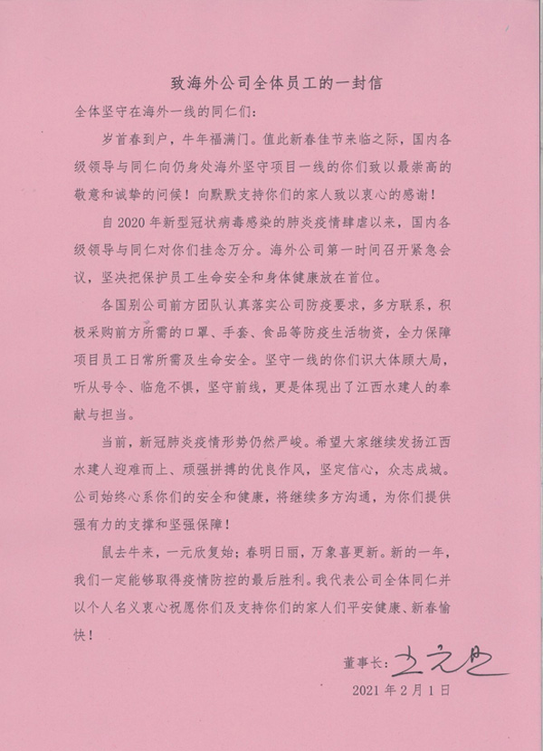 當前,新冠肺炎疫情形勢仍然嚴峻。希望大家繼續(xù)發(fā)揚江西水建人迎難而上、頑強拼搏的優(yōu)良作風,堅定信心,眾志成城。公司始終心系你們的安全和健康,將繼續(xù)多方溝通,為你們提供強有力的支撐和堅強保障!