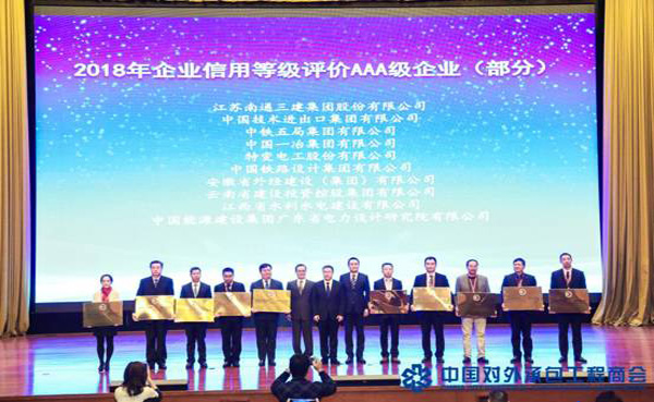 12月5日,中國對外承包工程商會第七屆理事會第四次全體會議在山東濟南隆重召開,來自全國各地的140多家理事單位的300多名代表參加會議。公司董事、海外公司執(zhí)行董事張周平出席會議。會議頒發(fā)了“2018年企業(yè)信用等級評價AAA級企業(yè)(部分)”牌匾,公司憑借良好的業(yè)績和口碑,再次榮獲中國對外承包工程企業(yè)信用評價AAA級信用企業(yè),并在現(xiàn)場受邀上臺接受授牌。