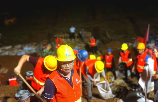 彭燦華是第一時間帶領抗洪搶險隊員趕赴現(xiàn)場與洪水戰(zhàn)斗的先遣軍。他連夜指導施工人員開展搶險工作,天黑路滑,他幾次摔倒在泥濘中,眼鏡上沾滿了泥點,渾身早已被泥水覆蓋,即便這樣,他還是一邊了解汛情水情,一邊指揮搶險,一邊將一線汛情匯報給公司,一邊頂著傾盆大雨加入到搶險的隊伍中,裝袋抬土,和搶險施的隊伍們奮戰(zhàn)在一起。